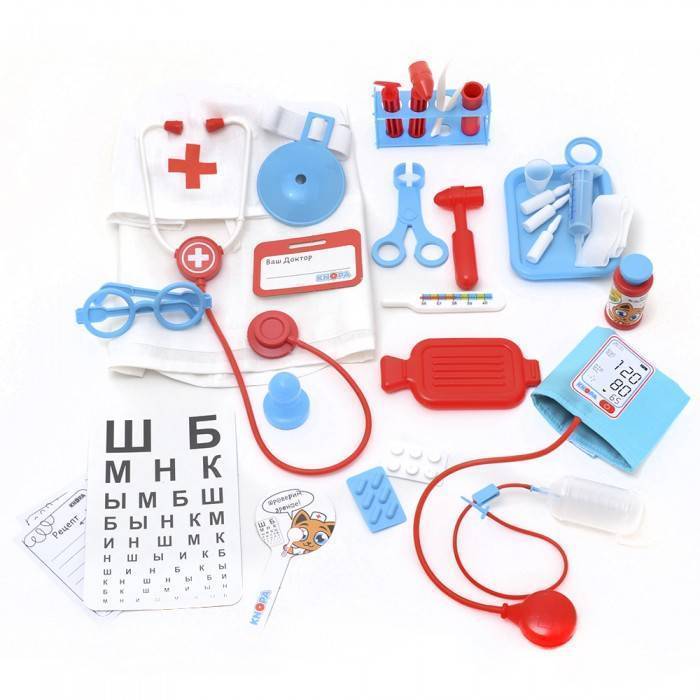 | Аксессуар в наборе | очки (1 шт), таблетки (1 упаковка 1, капсулы 1 упаковка ), пробирка (1 шт), колба (1 шт), банка (1 шт), бейдж (1 шт), шапка доктора (1 шт), лоток (1 шт), лист назначений врача (3 шт), халат доктора (1 шт), бинт (1 шт), грелка (1 шт), печать |