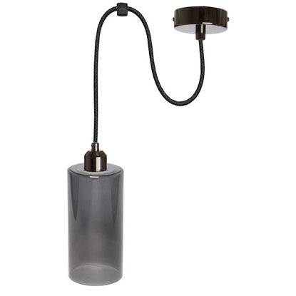 Модный подвесной светильник цвета темный хром с тканевым проводом графитного цвета и цилиндрическим плафоном серого цвета с легким зеркальным эффектом. В комплекте со светильником имеется крепление паук черного цвета для фиксации провода на потолке.