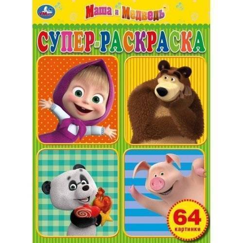 Для маленьких любителей раскрасок теперь все популярные герои в одной книжке. Чёткий толстый контур и интересные иллюстрации не только скрасят досуг вашего ребенка, но и подготовят его к школе. Развивающая книжка-раскраска "Маша и Медведь. Суперраскраска" ТМ "УМка". Интересная книжка-раскаска со множеством картинок и с изображениями любимых персонажей мультфильма "Маша и Медведь" сразу привлечёт внимание малыша. Способствует развитию мелкой моторики, художественного вкуса, фантазии и воображения ребёнка. Книжка-раскраска "Маша и Медведь. Суперраскраска" ТМ "УМка" 4 в 1: - Малышу понравится рисовать в книжке с изображениями любимых персонажей мультфильма; - 64 Картинки внутри: малыш всегда сможет найти задание себе по душе; - С развивающими короткими сюжетными текстами-вопросами для ребёнка; - Удобный формат А4 позволит брать с собой раскраску в детский сад и в путешествия.
