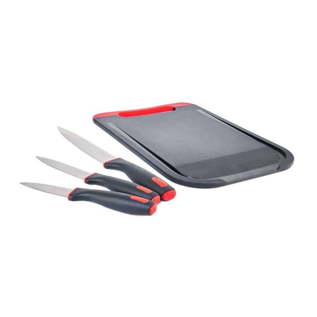 Материал: высококачественная немецкая нержавеющая сталь X30Cr13. Толщина клинка: 2 мм. Материал изготовления доски: полипропилен. Набор включает в себя: 3 ножа: поварской, универсальный, для овощей и доска.