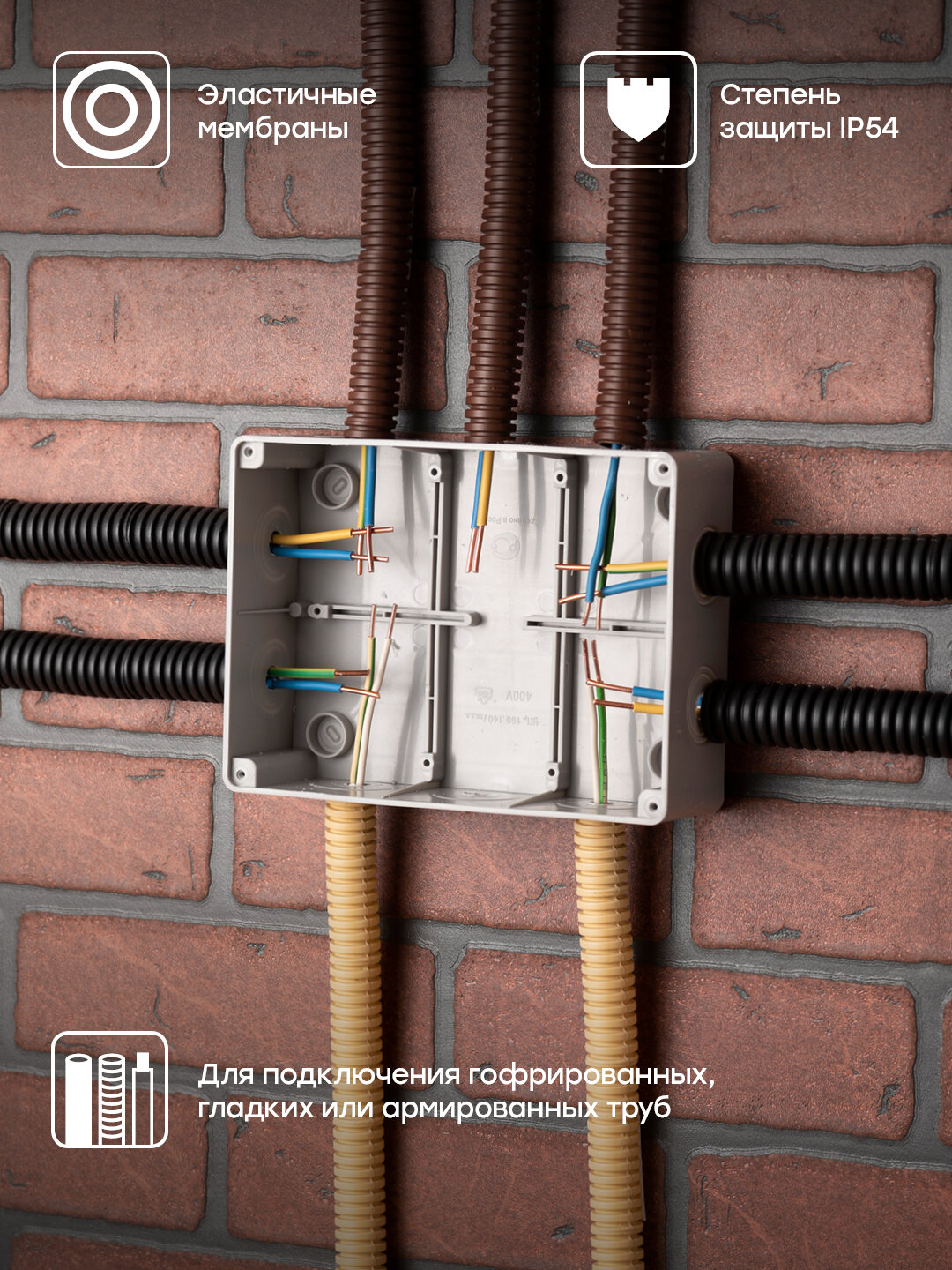 Коробка распаячная КМР-050-042 пылевлагозащитная, 10 мембранных вводов, уплотнительный шнур (190х140х70) EKF PROxima Самая важная функция монтажных коробок заключается в защите соединений жил кабелей от внешних воздействий: от пыли, влаги и механических повреждений. Монтажные коробки предназначены для создания длительной, безопасной и контролируемой установки проводки, телефонных стыков, розеток, выключателей, регуляторов освещенности и устройств связи. Также монтажные коробки применяют для создания эстетического вида интерьеров и фасадов, поскольку закрывают неприглядные концы жил и применяемые клеммники или колпачки СИЗ. Коробки распределительные для наружной проводки используются в комбинации с гофрированными, гладкими или армированными трубами для построения силовых или слаботочных сетей. Отличаются экономичностью. Все распределительные коробки этой серии имеют сальники для подключения гофрированных, гладких или армированных труб и обеспечения класса защиты в соответствие с нормами. Коробки распределительные предназначены для крепления на стены, потолки или на лотки. Имеют современный дизайн и отвечают требованиям станд