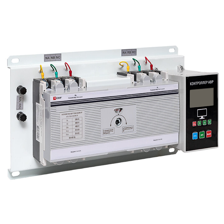 ОПИСАНИЕ. Устройство АВР TCM EKF PROxima предназначено для обеспечения резервным электроснабжением нагрузки, подключенной к системе электроснабжения, имеющей основной и резервный вводы. Устройство АВР автоматически подключает резервную линию питания в случае пропадания напряжения на основной линии. Устройство АВР ТСM EKF PROxima предназначено для обеспечения резервным электроснабжением нагрузки, подключенной к системе электроснабжения, имеющей основной и резервный вводы. Устройство АВР автоматически подключает резервную линию питания в случае пропадания напряжения на основной линии. Также устройство АВР ТСM имеет функцию защиты от токов перегрузки и коротких замыканий распределительных сетей и электродвигателей. Устройство АВР ТСM может быть настроено на несколько программ переключения. А) Питающие линии: электросеть – электросеть: автоматическое переключение на резервную электрическую линию при выходе параметров основной питающей электрической линии за установленные пределы, автоматический возврат с резервной линии на основную после восстановления параметров основной линии в установленные пределы. Установка времени задержки переключения между электрическими линиями; автоматическое переключение на вторую электрическую линию при выходе параметров первой питающей электрической линии за установленные пределы, без автоматического возврата со второй линии на первую после восстановления параметров первой линии в установленные пределы. Переключение на первую линию происходит автоматически после выхода параметров второй питающей электрической линии за установленные пределы. Установка времени задержки переключения между электрическими линиями; ручное переключение между питающими электрическими линиями. Б) Питающие линии: электросеть – генератор: автоматическое переключение на резервный генератор линии при выходе параметров основной питающей электрической линии за установленные пределы, автоматический возврат с генератора на основную после восстановления параметров основной линии в установленные пределы. Установка времени задержки переключения между электрическими линиями; ручное переключение между питающими электрическими линиями. Конструкция и основные функции: Устройство АВР выполнено в виде моноблока и состоит из контактного блока, блока управления и двух силовых автоматических выключателей в литом корпусе. На блоке управления имеется рычаг ручного переключения. Такая конструкция позволяет уменьшить высоту и площадь установки АВР.