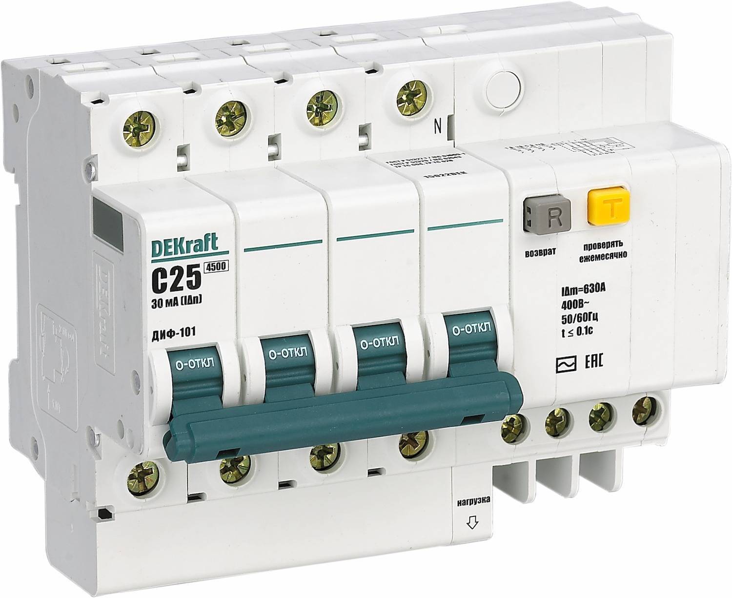 ДИФ-101 15055DEK Автоматический выключатель дифференциального тока трехполюсный 32А (тип AC, 4.5 кА) DEKraft