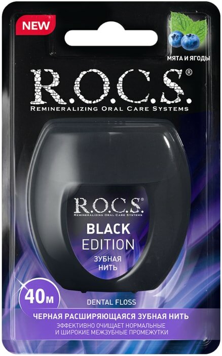 Лекарственная формаКрученая расширяющаяся зубная нить R. O. C. S. BLACK EDITIONОписаниеЗубная нить R. O. C. S. Black Edition с мятным вкусом обеспечивает свежее дыхание после каждого использования, помогает предотвратить воспаление десен, сохраняет здоровье и белизну зубов, освежает дыхание. Идеально подходит для людей с нормальными зубными промежутками.Расширяется во время использования что позволяет эффективно очистить широкие межзубные промежутки от зубного налета.- Не содержит фтор- Не повреждает десны- Изменяет сечение в процессе чистки обеспечивая безупречный уход- Придает свежесть Вашему дыханию- Хватает надолго! Длина 40 м.Обладает мягким мятным вкусом.ДействиеНить расширяется во время использования что позволяет эффективно очистить широкие межзубные промежутки от зубного налета.Способ применения и дозыДля достижения наилучших результатов при очистке каждого зубного промежутка используйте новую часть зубной нити, отматывая чистую нить с одного пальца и наматывая использованную нить на другой палец.Форма выпуска40 м.Производитель и организация, принимающие претензии потребителейR. O. C. S