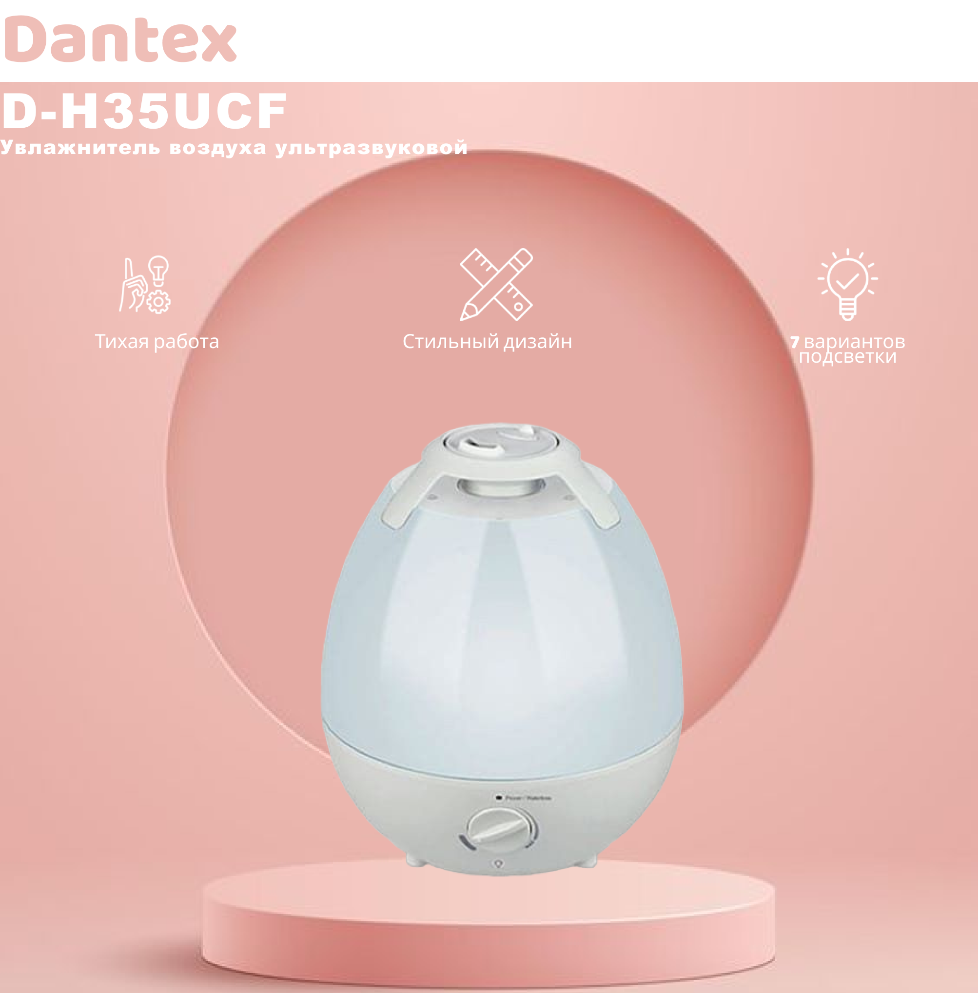 Dantex (Дантекс) D-H35UCF это компактный ультразвуковой увлажнитель с электронным управлением и современным эргономичным дизайном, предназначенный для использования в жилых и офисных помещениях. В рассматриваемой модели установлен таймер, что позволяет заранее определять время работы. Увлажнитель не производит шум и является абсолютно безопасным для здоровья людей.