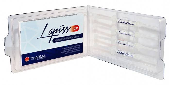 Набор для отбеливания зубов Lapiss CP 16% на основе 16% пероксида карбамида подходит для использования как в стоматологической клинике, так и для домашнего применения по назначению врача. При производстве использован карбамид швейцарского производства, высокое качество компонентов даёт мягкое воздействие на эмаль зубов при активации состава на эмали. А также он содержит в своем составе активные ионы кальция, которые участвуют в снижении гиперестезии, так как легко проникают в ткани зуба, встраиваясь в их структуру и укрепляя их.