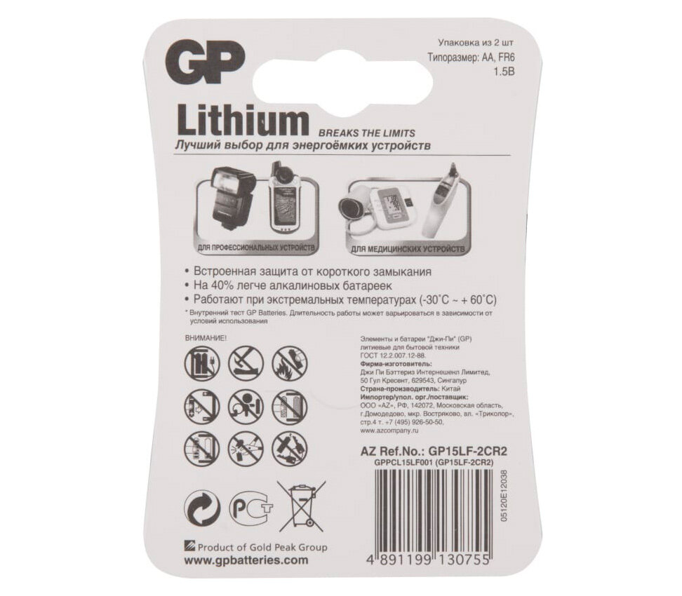 ПреимуществаСерия Lithium – это самые мощные бытовые элементы питания от компании GP. Они рассчитаны на использование в энергоемких устройствах: фототехнике, игровых приставках, игрушках, рациях и радиоустройствах, радиоуправляемых моделях. Например, заряда GP 15LF-2CR2 хватит, чтобы сделать около 800 фотографий со вспышкой профессиональной фотокамерой.Использование лития в элементах питания позволило сделать батарейки не только сверхмощными, но и сверхлегкими – они на 40% легче, чем обычные щелочные батарейки. Их эффективно можно использовать в широком диапазоне температур: от -40°С до +60°С. То есть ваши устройства будут надежно работать при самой экстремальной погоде – и в морозы, и в жару. Храниться такие элементы питания GP могут более 10 лет. В комплекте на блистере идут две литиевых батарейки GP, что удобно для транспортировки. Упаковка надежно защищает батарейки от влаги и механических воздействий. БезопасностьБатарейки GP соответствуют международным стандартам качества, поэтому подходят для использования всеми членами семьи, в том числе в детских игрушках.Температура хранения литиевых элементов питания не должна превышать +30°С при относительной влажности 55%±20%. Не складируйте их в холодильнике, рядом с металлическими предметами и открытыми источниками огня. Батарейки запрещается глотать, деформировать, разбирать, бросать в огонь или давать детям в качестве игрушек.