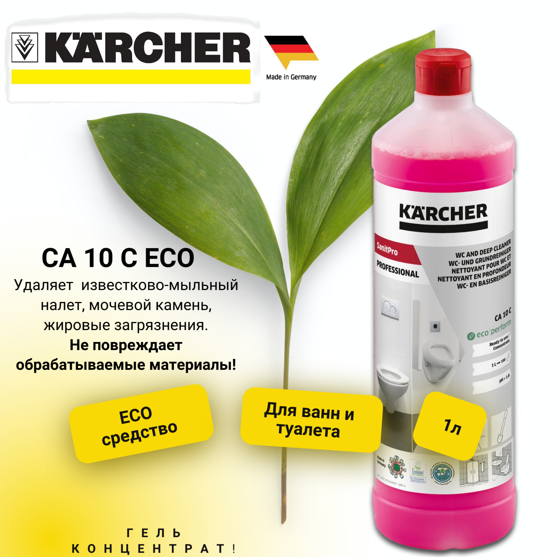 Высокоактивное концентрированное средство Karcher SanitPro CA 10 C eco! perform для общей чистки. Отличается высокой эффективностью и быстродействием. Удаляет стойкие загрязнения и отложения, образующиеся в санитарных помещениях: известково-мыльный налет, мочевой камень, жировые загрязнения и следы каблуков, также может использоваться для чистки унитазов.Гелеобразная формула CA 10 C позволяет средству хорошо держаться на вертикальных поверхностях и гарантирует экономный расход. После промывки поверхности высыхают без образования разводов. Средство CA 10 с эффектом «Easy-to-clean»: препятствуют налипанию грязи и облегчают последующую уборку, оно не повреждает обрабатываемые материалы, создает стойкий и приятный запах свежести. Сертифицировано по экологическим стандартам ЕС (знак экологической безопасности).Дозировка от 10 % до неразбавленного состояния.ХарактеристикиНазначение - ручная уборкаОбъём - 5 лСрок годности - 24 мес