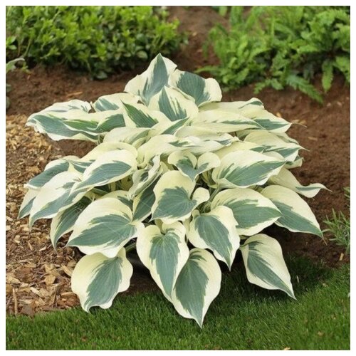 Фирн Лайн - высота растения 25 см, ширина 40 см. Листья сине-зеленые с желтой каймой, сердцевидной формы. Цветы бледно-лавандовые.