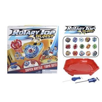 Игрушка - аналог Bey Blade. Материал, из которого изготовлен волчок – пластик. Волчок состоит из трёх деталей. Верхняя бывает 4 видов в зависимости от того, какая особенность в ней преобладает: выносливость, атака, баланс, защита. Центральная деталь различается по весу и форме и регулирует центр тяжести. Основание волчка влияет на то, как он будет вращаться. Комбинируя различные верхние, центральные детали и основания, можно каждый раз создавать уникальный волчок, подходящий для борьбы с определенным противником. Поэтому, чем больше волчков будет в коллекции, тем больше комбинаций можно составить, и тем больше шансов выиграть. Игра проводится на игровом поле и ее цель – вытолкнуть волчок соперника из него. Комплектность: верхняя часть волчка - 2 шт., волчок - 2 шт., основание - 2 шт., пусковое устройство - 2 шт., арена, наклейки.