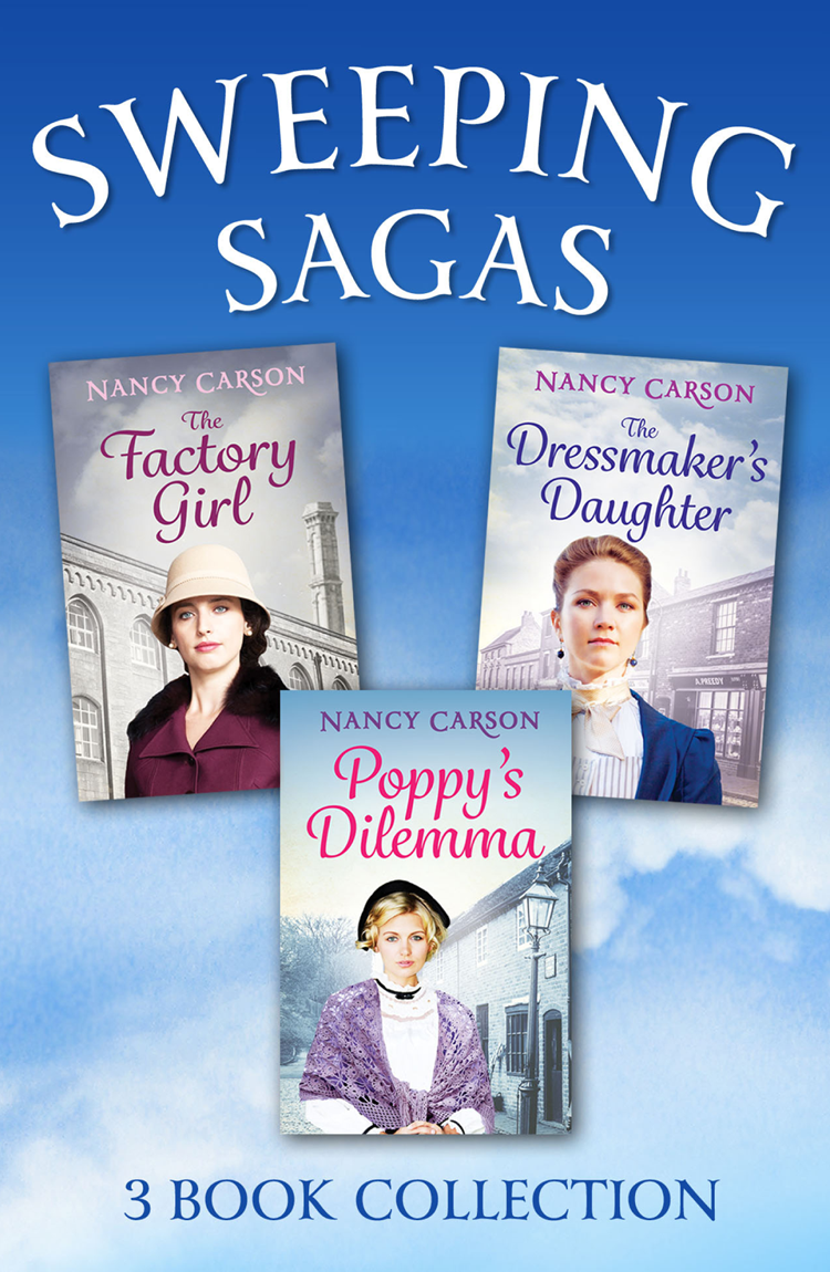 A glorious collection of sweeping sagas – intrigue, romance, danger and delight.From the Kindle bestselling saga author Nancy Carson comes a real treat of a collection. Discover Poppy’s Dilemma, meet The Dressmaker’s Daughter and find out what happens to The Factory Girl in this special three-book edition.As romantic dreams are destroyed by war, the Great Depression strikes the Black Country and hopes and dreams are snatched away, these three heart-warming heroines will risk everything for true love, and bravely search for happiness against all the odds.A must-read for fans of Dilly Court and Kitty Neale.