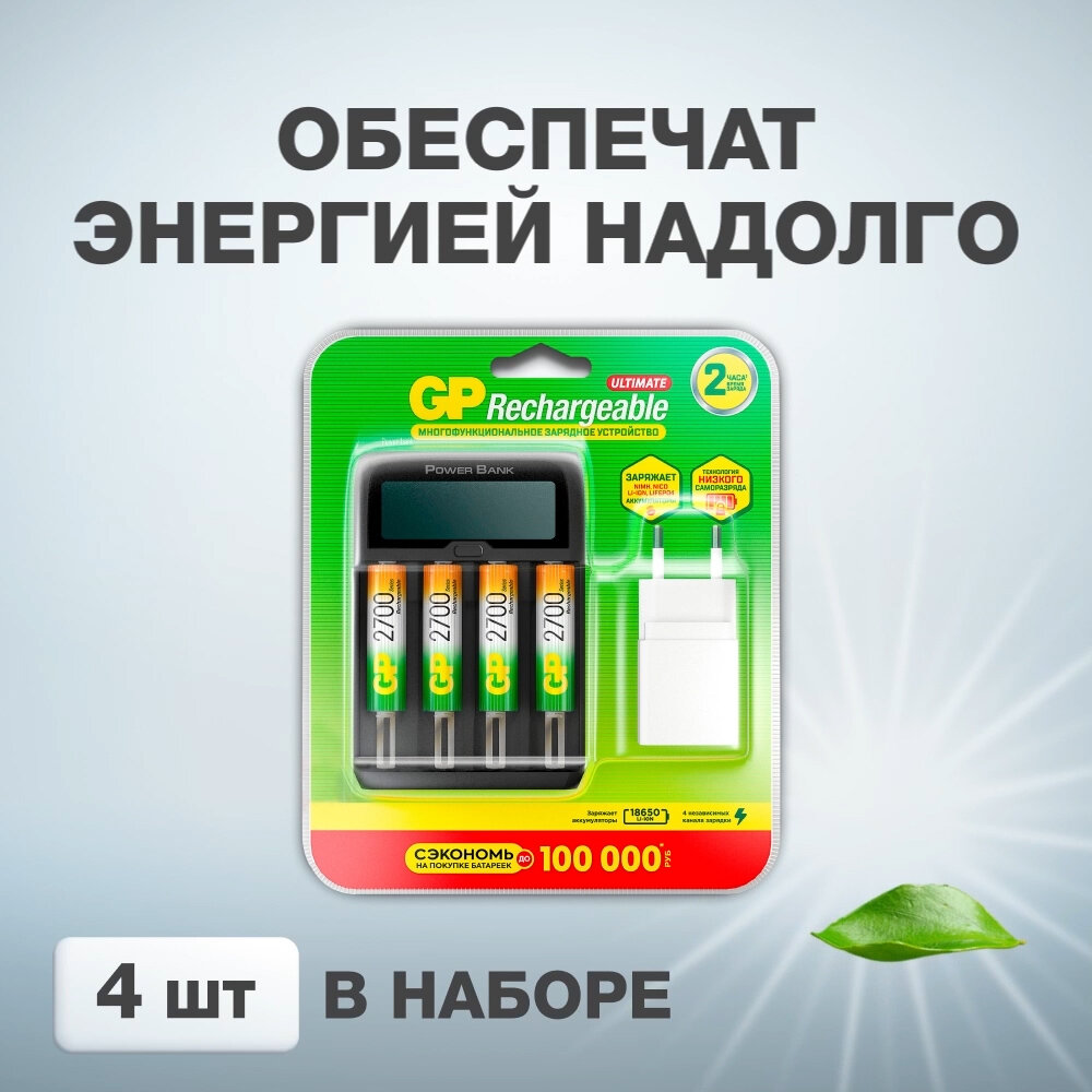 Зарядное устройство GP270AAHCMHSPBA-2CR4 предназначено для зарядки аккумуляторных батарей типов Ni-Mh/CD, Li-Ion и LiFePO большинства выпускаемых типоразмеров. Поставляется в комплекте с четырьмя перезаряжаемыми аккумуляторами GP 2700 series Rechargeable типоразмера АА. В комплекте есть всё для того, чтобы Ваши батарейки всегда были заряжены и устройства не переставали работать. Зарядник имеет небольшой размер и вес, благодаря своей компактности очень удобен в путешествиях. Корпус чёрный, из прочного пластика, оснащён электронным дисплеем и кнопкой управления, подвижные контакты позволяют использовать устройство для зарядки батарей разного размера. Аккумуляторы быстро заряжаются, при этом Вы можете одновременно зарядить батареи разных типов. Зарядное устройство поставляется в комплекте с аккумуляторами GP, которые, в свою очередь, имеют ряд преимуществ: однократно заряженные батарейки могут использоваться длительное время; остаются заряженными дольше, если не используются; совместимы с различными приборами, с высоким и низким энергопотреблением; могут перезаряжаться с помощью любых зарядных устройств; экономически выгодны и безопасны для окружающей среды. Аккумуляторные батареи GP 2700 series - наиболее мощныe в линейке GP, комплект из 4-х таких элементов питания заменяет до 2000 обычных батареек и рассчитан на 500 перезарядок с сохранением 80% номинальной емкости. Принцип работы Устройство подходит для быстрой зарядки аккумуляторов следующих типоразмеров: 1.28, Ni-Mh/NiCD: АААА, ААА, АА, А, SC, C 3,6/3.78, Li-Ion; 3,28/LiFePo4; 10440/14500/14650/16340/17355/17500/17670/18350/18500/18650/18700/20700/ 21700/22650/22700/26500/26650. В комплект входят: кабель микро-USB/USB Type-C; многофункциональное USB зарядное устройство; адаптер 2А. Возможна одновременная зарядка батарей типа Ni-Mh/CD, Li-Ionи LiFePO. Устройство снабжено дисплеем, на котором можно увидеть следующую информацию; напряжение; емкость; зарядный ток; тип заряжаемого аккумулятора; каналы заряда; процент заряда. Под дисплеем находится кнопка управления. Питание возможно от электрической сети 220 В с помощью USB адаптера или от компьютера через USB-разъем. Время зарядки зависит от емкости аккумулятора. Состояние заряжаемых аккумуляторов можно определить по состоянию дисплея: при окончании зарядки в данном канале на экране появится надпись «Full». После этого зарядка в данном канале остановится. При помещении в зарядное устройство неперезаряжаемых или поврежденных батарей появится надпись «Err». При недостатке входной мощности появится надпись «LowInput». Для зарядки необходимо установить элементы питания в зарядное устройство, соблюдая полярность (+/-).