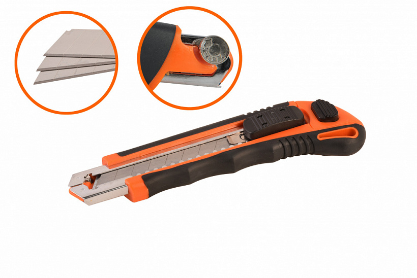 Нож используется для разрезания ткани, бумаги, картона, проводов, а так же более плотных материалов ( линолеума, гипсокартона и т.д.) Ручка позволяет хранить в ней сменные лезвия для того, чтобы они были всегда под рукой для оперативной замены. Автоматическая подача в разы ускоряет смену отработанных лезвий и позволяет быстро вернуться к работе. Обрезиненная рукоятка обеспечивает полный контроль инструмента. Металлическая направляющая исключает случайный слом лезвия. Дополнительный винтовой фиксатор лезвия на конце направляющей поможет легче работать с особо плотными материалами.