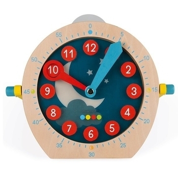 Который сейчас час? Этот учебный набор французского бренда Janod предназначен для всех детей, которые изучают время и его ход. Деревянные часы имеют ручку-опору (можно использовать для переноски) и регулируемые стрелки, которые очень плавно двигаются. В наборе также есть карточки (14 шт.) и маркеры (2 шт.). благодаря которым дети также могут потренироваться.