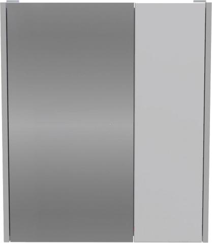 Зеркальная полка предназначена для хранения бытовой химии и утвари. За дверцей слева находятся две переставные полки. За распашной дверцей справа находится одна переставная полка. Корпус и фасад полки выполнены из ЛСДП, фасад покрыт высокоглянцевой эмалью.