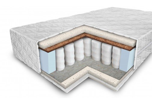 Особенности:Чехол из ткани Жаккард: представляет собой крупноузорчатую ткань, образующуюся в результате переплетения основной и уточной нити. Эта ткань отличается не только прекрасным дизайном. Можно выделить такие её замечательные свойства как: прочность, долговечность (нити материала очень тесно переплетены и перекручены, что защищает от распускания петель и увеличивает качество ткани), невосприимчивость к температурным перепадам, устойчивость к износу (механическое воздействие не приводит к быстрому изламыванию нитей). Уход за матрасным чехлом, выполненным из ткани жаккард: допускается только сухая чистка. Материал Airfoam: двухкомпонентный материал, состоящий из гранул пенополиуретана и связующего вещества – полиэфира. Технология PressFree позволяет бережно и надежно соединить волокна различных цветов и фактур, обеспечивая материалу легкость и повышенную вентилируемость (2 см). Кокосовая койра: производится из тщательно отобранных волокон кокосовой пальмы в виде плит и характеризуется высоким уровнем жёсткости. Вместе с тем, кокосовая койра довольно гибкая и отличается хорошей воздухопроницаемостью. Её используют в качестве наполнителя для придания матрасу жёсткости. Для лучшего скрепления волокон кокосовая койра пропитывается латексом (1 см). Независимый пружинный блок TFK 100: в данном пружинном блоке каждая пружинка работает отдельно друг от друга, за счёт чего происходит точечное распределение нагрузки на матрас и создаётся оптимальный комфорт для позвоночника (ортопедический эффект). Каждая пружинка одета в чехол из ткани спанбонд. Пружины рассчитаны на нагрузку до 100 кг на одно спальное место. Количество пружин – 232 штуки на 1 м.кв. Термохлопок: тонкий и прочный материал, который укладывается сверху и снизу от пружинного блока и защищает матрас от вдавливания пружин в материалы наполнения.