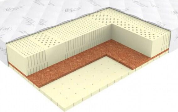 Монолитный латексный блок. Разделен на зоны. Каждая зона имеет свою плотность за счет перфораций. Такая технология помогает латексному блоку заменять пружинный блок и обеспечивать правильную поддержку всего тела Натуральный латекс. Натуральный гипоаллергенный материал на основе сока гевеи. Благодаря своей эластичности и упругости способен выдерживать большое давление и восстанавливать свою первоначальную форму, что создает максимально комфортное спальное место. Материал обеспечивает оптимальный тепловой режим: прохладу летом и тепло зимой. Кокосовое волокно. Натуральный гипоаллергенный материал. Благодаря пропитке волокна прочно скреплены в цельную плиту. Кокосовое волокно придает матрасу жесткость и обладает бактерицидными свойствами.