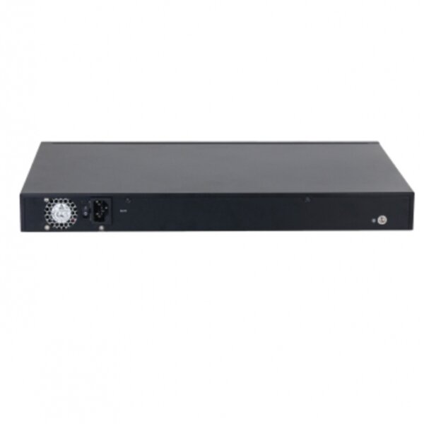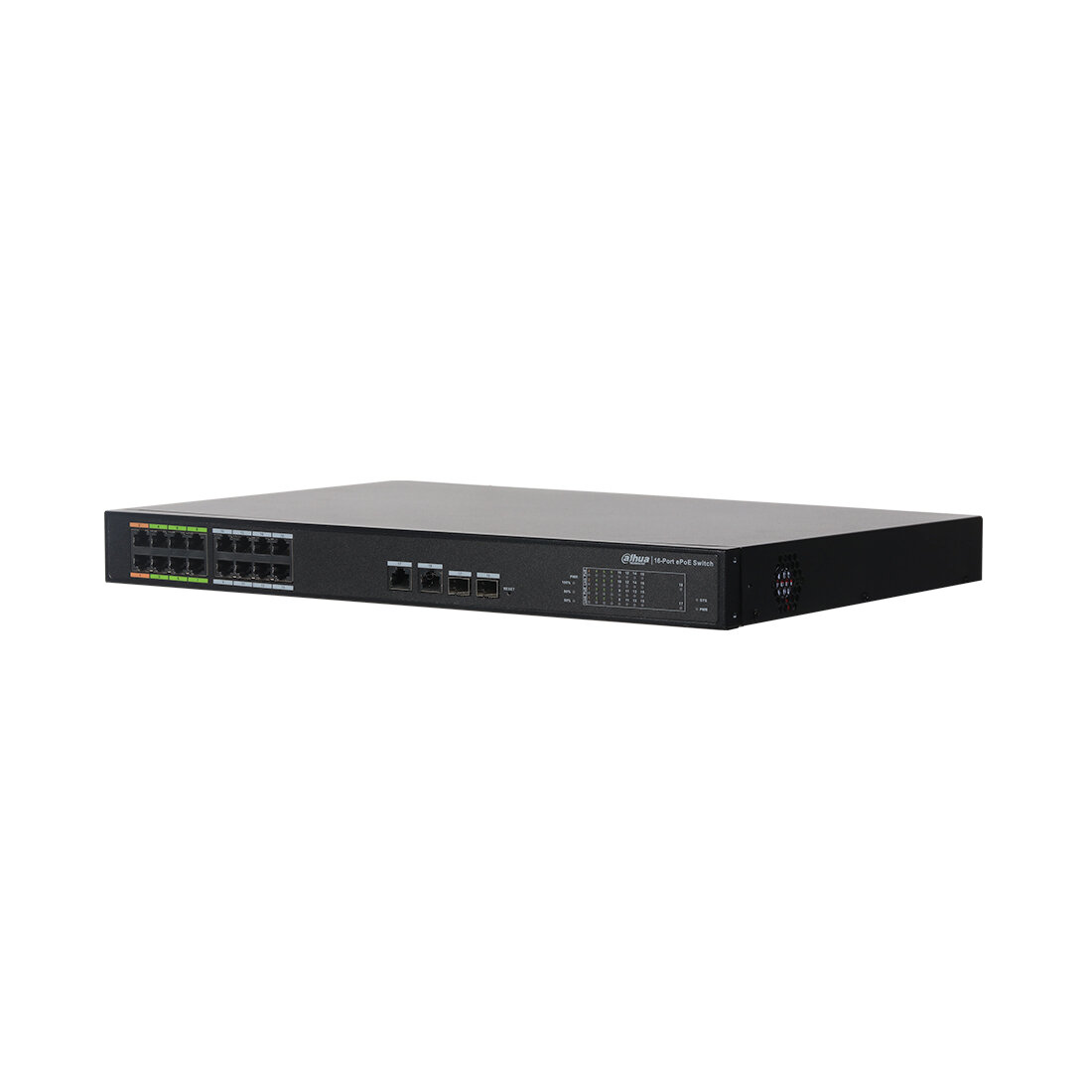 Управляемый коммутатор второго уровня Dahua оборудован четырьмя гигабитными RJ-45, 16 РоЕ-портами. Восемь из PoE-портов поддерживают ePoE: передают данные и подают питание на расстояние до 800 м по витой паре и до 1000 м — по коаксиальному кабелю. На максимальном расстоянии скорость составляет 10 Мбит/с. Бюджет PoE: общий — 240 Вт, на порт — 30 Вт, на два порта, отмеченные оранжевым цветом (приоритетные), — 60 Вт.