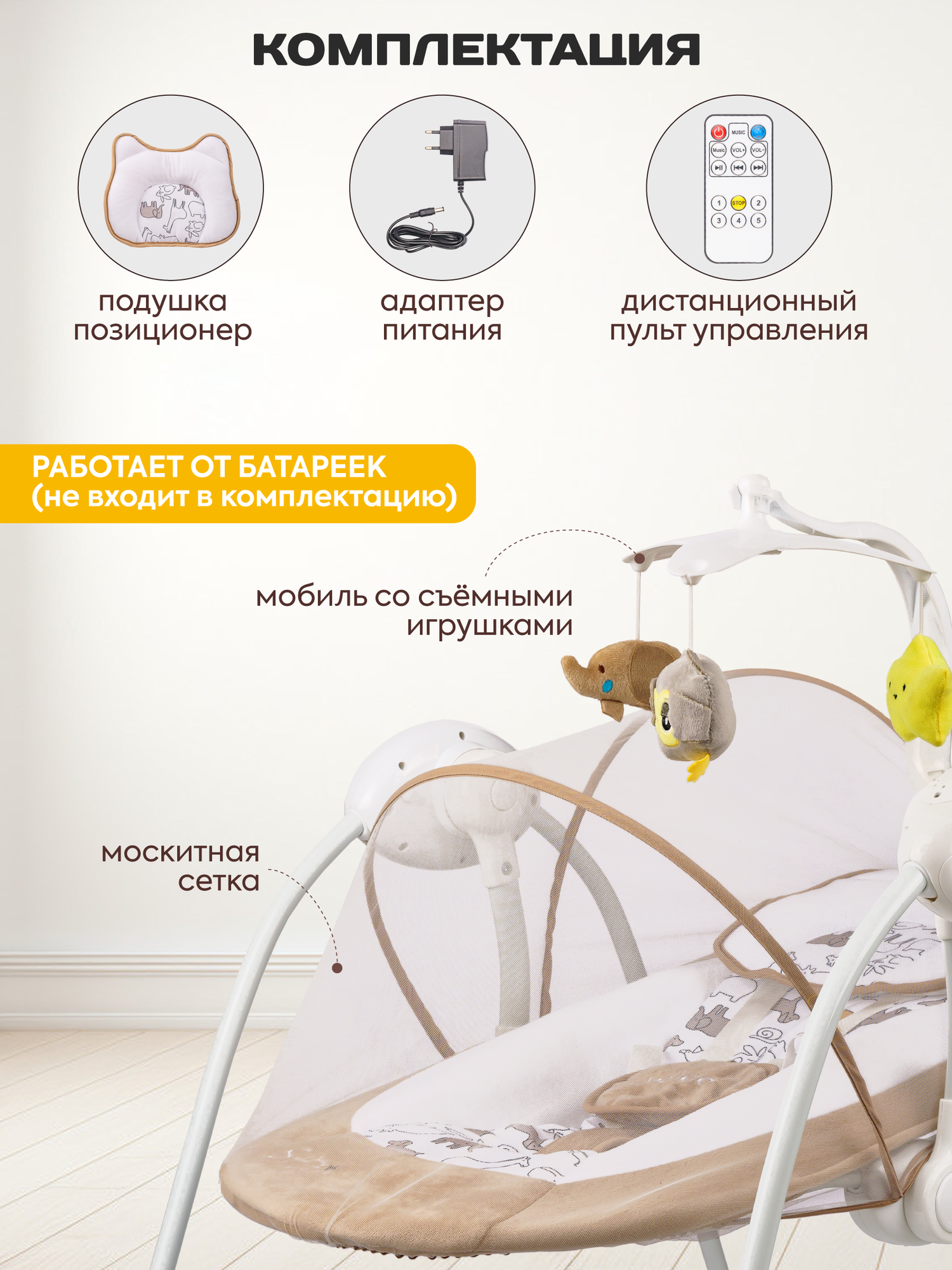| Комплектация | электокачели, москитная сетка, пульт, адаптер питания, мобиль с игрушками |