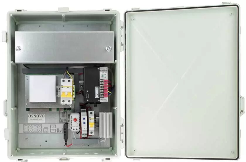 Управляемый агрегирующий PoE-коммутатор Osnovo рассчитан на круглогодичную уличную работу: защита корпуса от пыли и влаги соответствует стандарту IP66, диапазон рабочих температур — -50 ºС… +50 ºС, предусмотрен набор гермовводов и безвентиляторная конвекционная система термостабилизации с нагревательным элементом.
