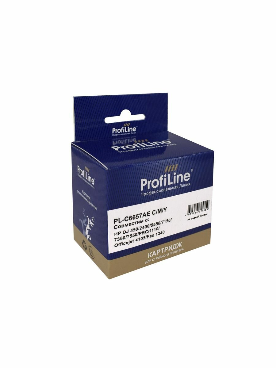 Струйный картридж ProfiLine с чернилами на водной основе Cyan/Magenta/Yellow 17 мл PL_C6657AE_C/M/Y предназначен для печати.Качество печати не отличается от оригинальной продукции. Высокая стойкость пигмента: не осыпается и не выцветает. Отличная цветопередача и четкость линий при печати.Экономичность в обслуживании: среднее количество перезаправок - 3-5 раз. Упаковка опечатана и защищена от первого вскрытия.Дизайн упаковки может быть изменен производителем.