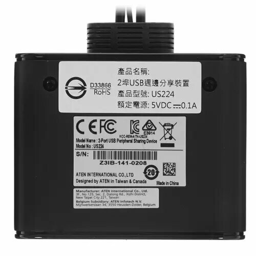 Переключатель ATEN KVM Switch относится к типу 2-х портовых переключателей и способен поддерживать работу сразу 4 USB-устройств: клавиатуры, мыши и до двух периферийных устройств, имеются 2 встроенных шнура. Используемый порт переключателя обозначается при помощи светодиодной подсветки.