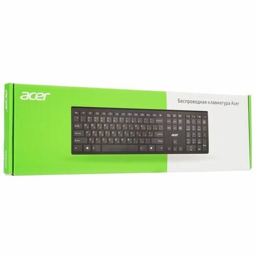 Клавиатура Acer имеет расстояние между клавишами небольшое. Кнопки невысокие и имеют хороший ход. Клавиатура имеет беспроводное подключение и связывается с компьютером через радиоканал. Небольшой приёмник подключается через интерфейс USB. Клавиатура Acer оборудована 4 специальными мультимедийными клавишами. На клавишах белым цветом изображены английские буквы, русская раскладка - яркого оранжевого цвета.