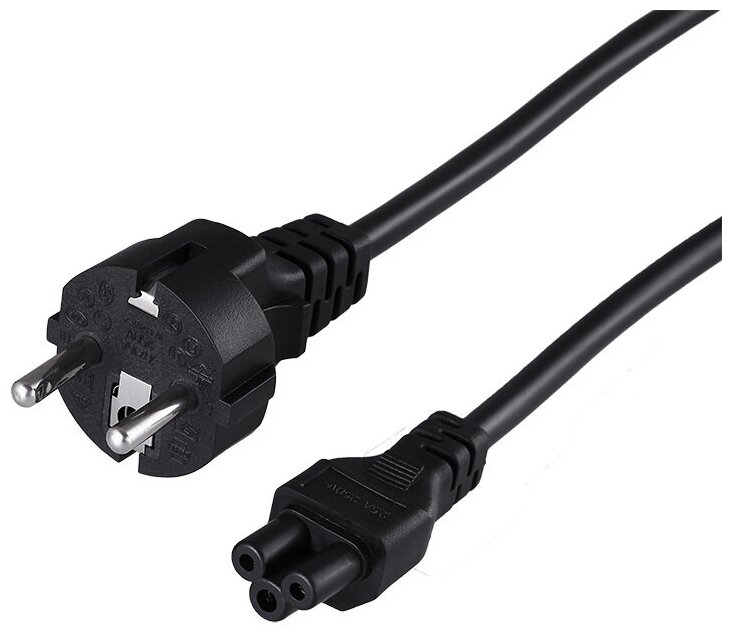 Шнур сетевой Евро 3х0.75мм² 1.8М (PVC) (с заземлением) (ноутбук) REXANT предназначен для подключения к сети переменного тока (AC) с напряжением 220B портативных компьютеров, ноутбуков, проекторов и других устройств, имеющих штыревой разъём типа C6. Данный шнур сетевой Евро (IEC cord) оснащен с одной стороны неразборной литой вилкой (евростандарт) с заземляющим контактом, с другой литым трёх контактным гнездовым разъёмом типа C5 (в обиходе называют «Микки Маус» или листом клевера) и трехжильным проводом с сечением жил 0.75мм².
