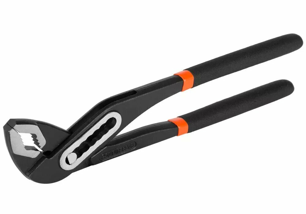Переставные клещи с кнопочным механизмом фиксации предназначены для захвата разнообразных по форме предметов в широком диапазоне размеров. Они используются в качестве трубного или разводного ключа. Особенностью данного инструмента является возможность зафиксировать выбранный диапазон раствора губок и предотвратить самопроизвольное его изменение в раскрытом состоянии клещей, что свойственно преставным клещам традиционной конструкции. Данная особенность существенно упрощает работу, снижает время на промежуточную подготовку и повышает комфортность использования клещей. Высокая прочность и износостойкость. Рабочая часть клещей выполнена из высококачественной хромованадиевой стали и имеет твердость 53 HRC. Оксидное покрытие обеспечивает защиту от коррозии и долгий срок службы. Удобство и практичность. Длинные рукоятки используются в качестве рычага, чтобы увеличить прикладываемое усилие.