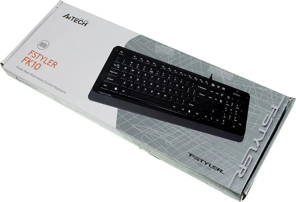 Доступная по стоимости клавиатура A4 Fstyler FK10 подключается к компьютеру посредством USB-порта. Длина кабеля составляет 1.5 м. Клавиши обладают квадратной формой, обозначения английских и русских букв выполнены белым цветом. Имеются дополнительные мультимедийные клавиши. Плюсом модели становится то, что производитель оснастил ее защитой от попадания внутрь жидкости.