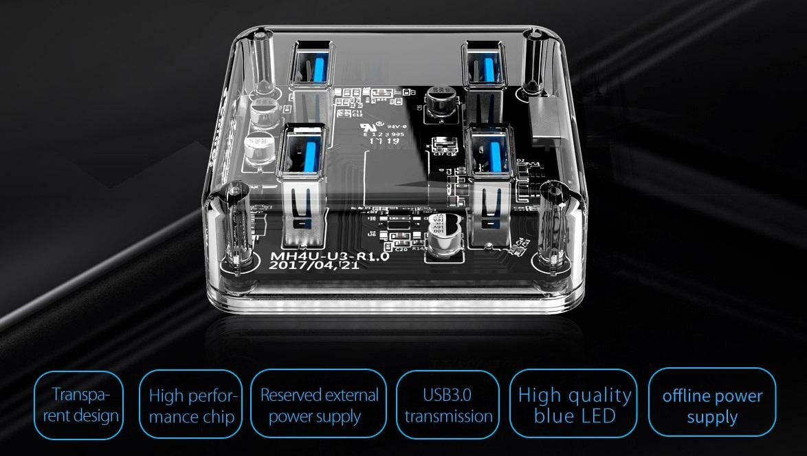 Высокоскоростной Хаб USB Orico MH4U-U3 отличается оригинальным дизайном и является не только полезным девайсом, но и стильным дополнением рабочего стола. Полностью прозрачный корпус - видимая красота сочетания науки и технологий. Возможность видеть передовую начинку работающего девайса - эстетическое наслаждение для ценителя технологий. Надежный процессор, продуманное расположение элементов на плате - все вызывает позитивный настрой и радость пользования устройством.