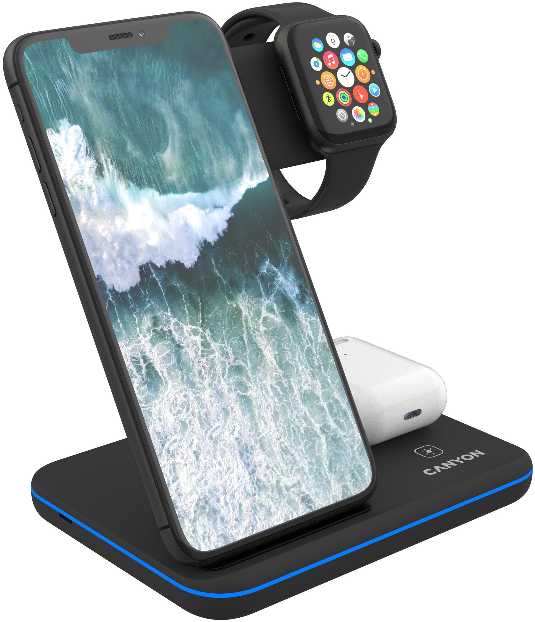 Эта беспроводная зарядная станция с функцией быстрой зарядки совместима с устройствами, оснащенными QI. Конструкция позволяет одновременно заряжать Apple Watch, iPhone и Airpods. Расстояние зарядки до 7 мм позволяет заряжать смартфон, не снимая чехол.