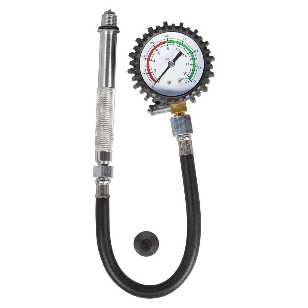 Компрессометр состоит из манометра, присоеденительного шланга с резьбовым наконечником, запорного клапана.