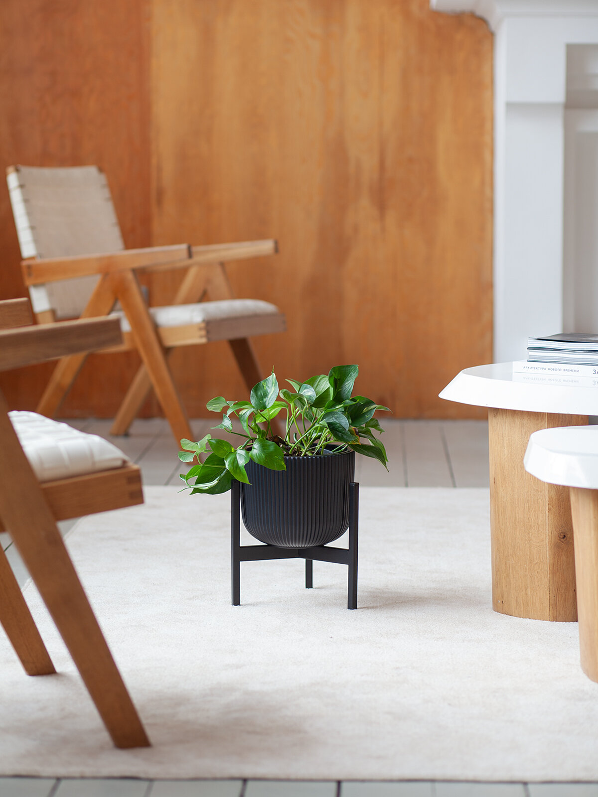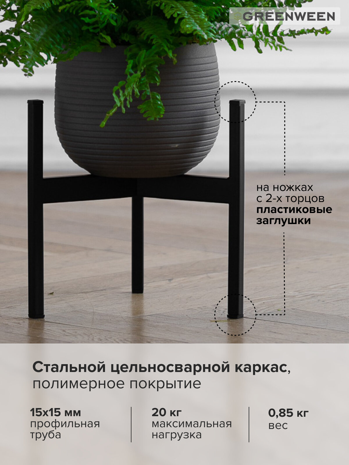 Неразборная конструкция на трёх ножках. Возможность двустороннего использования (глубина 9 и 13 см). Минималистичный дизайн. Пластиковые заглушки на ножках. Подходят под разные типы горшков и кашпо (D от 22 до 26 см).