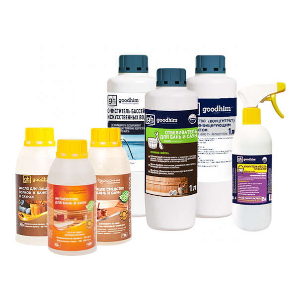 | Комплектация | Масло для защиты полков в бане и сауне GOODHIM (запах хвои)(металл), 0,75 л, моющее средство для бань и саун GOODHIM T150 (с ароматом хвои), 1 л (2 штуки), отбеливатель для бань и саун, GOODHIM DW400S, 1 л, антисептик для бань и саун, GOODHIM S200, 0.5 л, очиститель бассейнов и искусственных водоемов, GOODHIM 550 ECO без хлора, 1 л, уничтожитель плесени + очиститель межплиточных швов GOODHIM AP 650, 0.5 л, средство с дезинфицирующим эффектом GOODHIM БИО-Т Антисептик (концентрат), 1 л. |