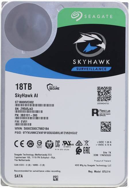 Жесткий диск SEAGATE SkyHawkAI , 18ТБ, HDD, SATA III, 3.5" ST18000VE002