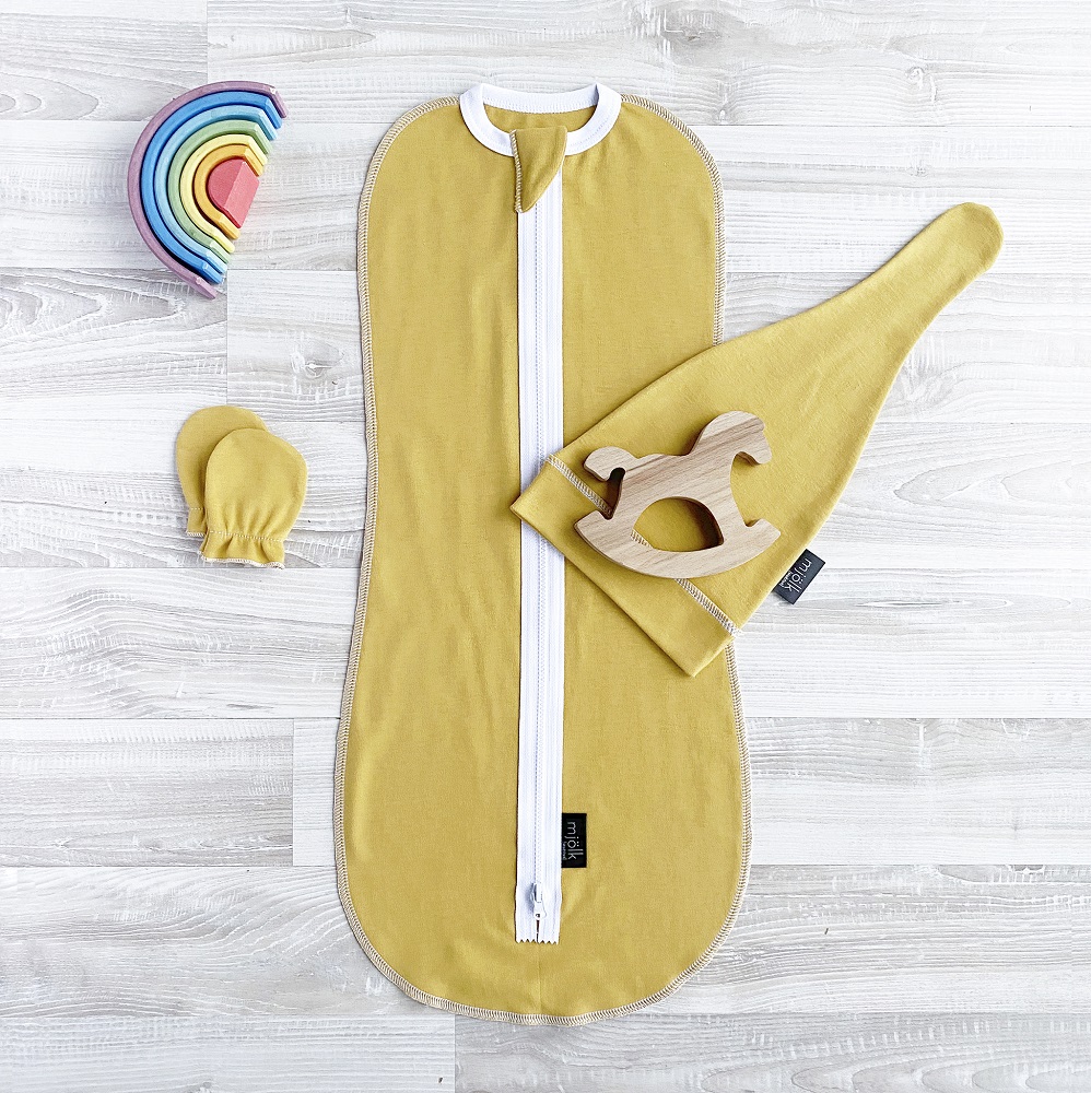 Комплект Mjolk Mustard Set: пеленальный кокон, шапочка, антицарапки, 3-6кг