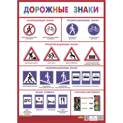 Плакат большого формата на картоне познакомит дошкольников с дорожными знаками и сигналами светофора.