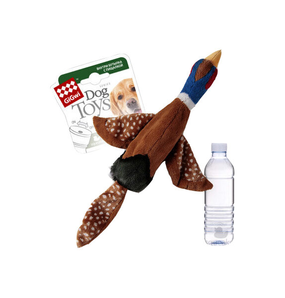 Игрушка для собаки. Птица с пластиковой бутылкой (0,5 л) с пищалкой в крышке. Набивка в теле игрушки отсутствует. В голове набивка и пищалка. Крышка бутылки имеет 2 положения, позволяющие блокировать пищалку. Бутылку можно менять. Размер: 57 см.
