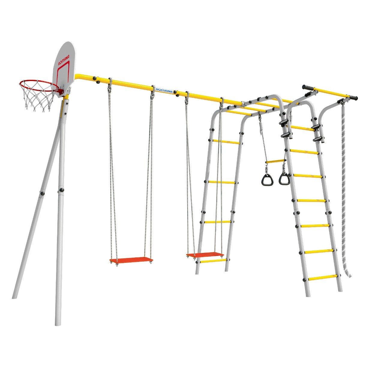 | Комплектация | турник подвижный, качели пластиковые 2 шт, рукоход, баскетбольное кольцо, канат, кольца с перекладиной |