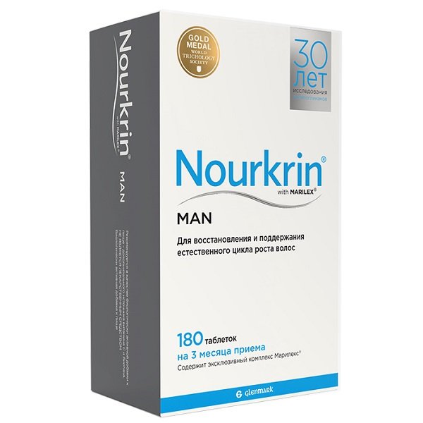 Нуркрин для мужчин / Nourkrin Man - всемирно известный продукт нового поколения для роста и сохранения волос, за счёт восстановления цикла их роста благодаря эксклюзивному комплексу с протеогликанами. Специальные особенности: Единственный продукт, содержащий запатентованный протеогликановый комплекс MARILEX® С научной точки зрения продукты линейки Nourkrin® разработаны для обеспечения организма человека питательными веществами, необходимыми для нормализации и поддержания естественного цикла роста волос, особенно при наличии дисбаланса. Nourkrin® содержит эксклюзивный комплекс Марилекс®, являющийся источником специализированных белков (протеогликанов), участвующих в формировании и поддержании жизненного цикла волосяных фолликулов кожи головы. Кроме того, Nourkrin® обогащен специально подобранным комплексом витаминов, обеспечивающим корни волос необходимыми питательными веществами. Результат: Помогает предотвратить и остановить выпадение волос, способствуя их здоровому росту. Способствует восстановлению естественного цикла роста волос по 3-м направлениям: - Усиление роста имеющихся волос; - Стимулирование роста новых волос; - Укрепление и общее оздоровление волос. Согласно проведенным исследованиям непрерывное курсовое применение продуктов линейки Nourkrin® от 6 месяцев и более (до 12 месяцев) является предпочтительным для получения значительного положительного действия, также 83% потребителей отметили существенное улучшение состояния волос после использования Nourkrin® Перед употреблением «Нуркрин для мужчин / Nourkrin® Man» следует внимательно ознакомиться с содержанием листка-вкладыша. При необходимости проконсультироваться со специалистом. Показания Выпадение волос, плохой рост волос, ухудшение качества и истончение волос