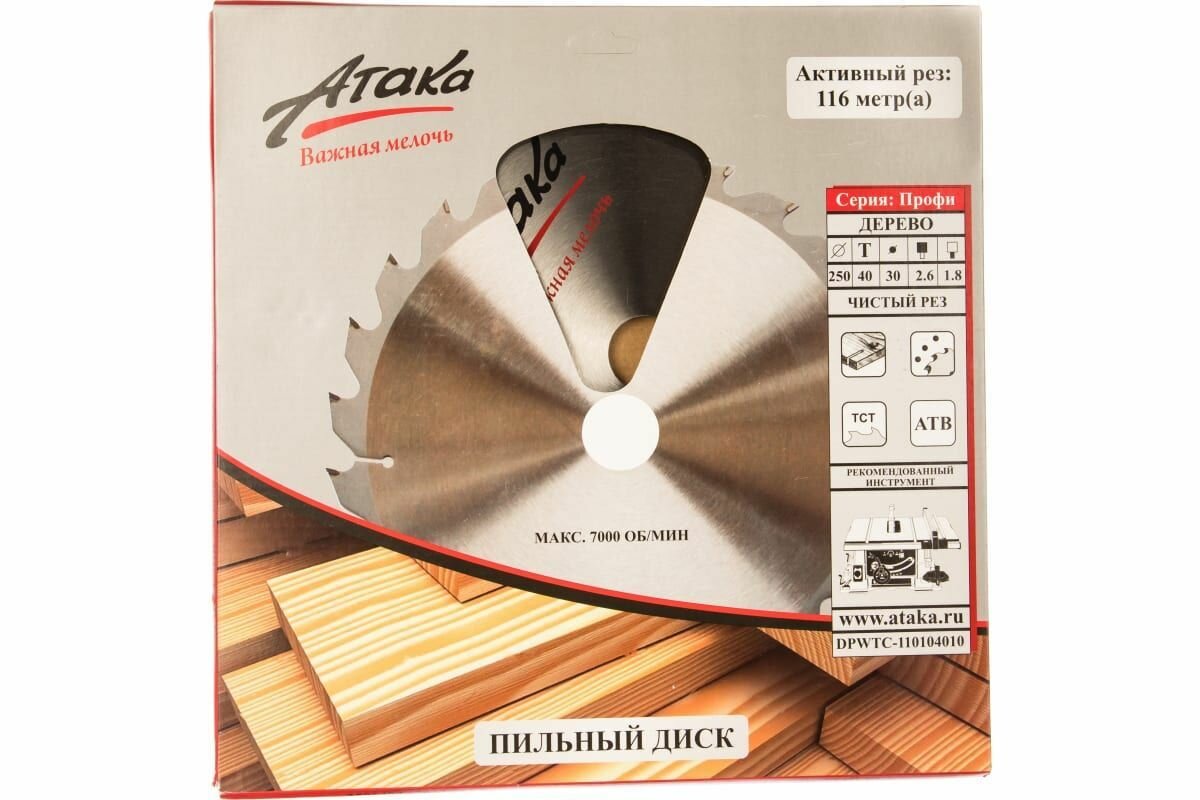 - Код производителя: Диск пильный 250*40T*30 дерево ч/рез профи Атака
