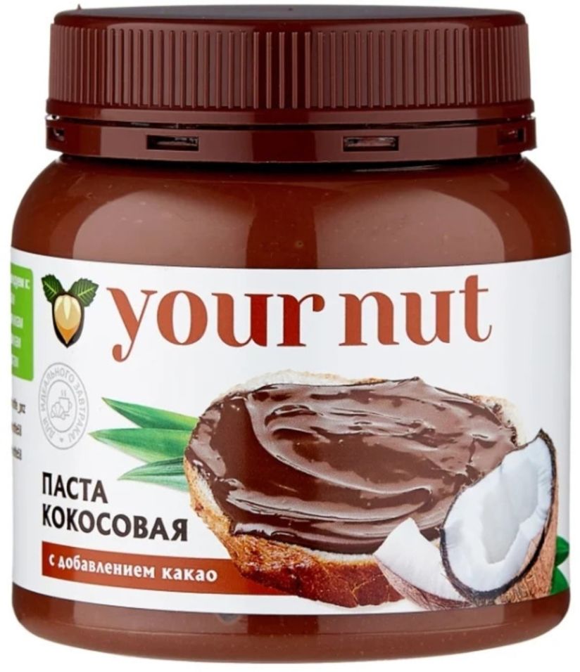 Кокосовая паста с добавлением какао- сладкое тропическое счастье! Она станет любимицей всех сладкоежек! Гармоничное сочетание кокоса и какао - прекрасное дополнение для любого чаепития. Добавляйте кокосовую пасту Your nut в кашу, подавайте к блинам или сырникам, к хрустящему печенью и вы надолго влюбитесь в это сочетание пользы и вкуса! Благодаря какао-бобам эта кокосовая паста содержит максимум какао. Именно их вкус делает пасту крайне вкусной и полезной одновременно! Нежная кокосовая паста Your nut – очень вкусное и полезное дополнение к вашему рациону. Кокос снабжает наш организм витаминами Е, В и С, а также кальцием, натрием, калием и железом. Содержащиеся в нем пищевые волокна улучшают пищеварение, очищая кишечник от токсинов и шлаков. Польза кокоса также в том, что он очень хорошо влияет на зрение. Происходит это за счёт содержания в нём витамина А и некоторых биологически активных компонентов. Кокос, химический состав которого полон клетчатки и витамина В6, положительно влияет на наши сосуды, нормализует холестерин, тем самым улучшая общее самочувствие.