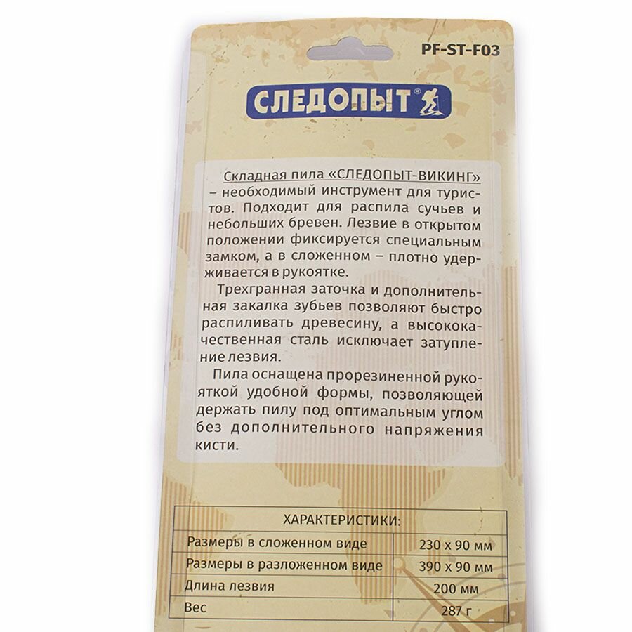 Ножовка Следопыт — необходимый инструмент для туристов, охотников, рыболовов и садоводов. Лезвие выполнено из нержавеющей стали и подходит для распила сучьев и небольших бревен. Высококачественная трехгранная заточка позволяет быстро распиливать древесину и исключает затупление лезвия. Так же пила оснащена кнопочным фиксатором, который надежно закрепляет лезвие в крайних положениях, а рукоятка с обрезиненным захватом не скользит в руке и делает процесс работы приятным и безопасным.