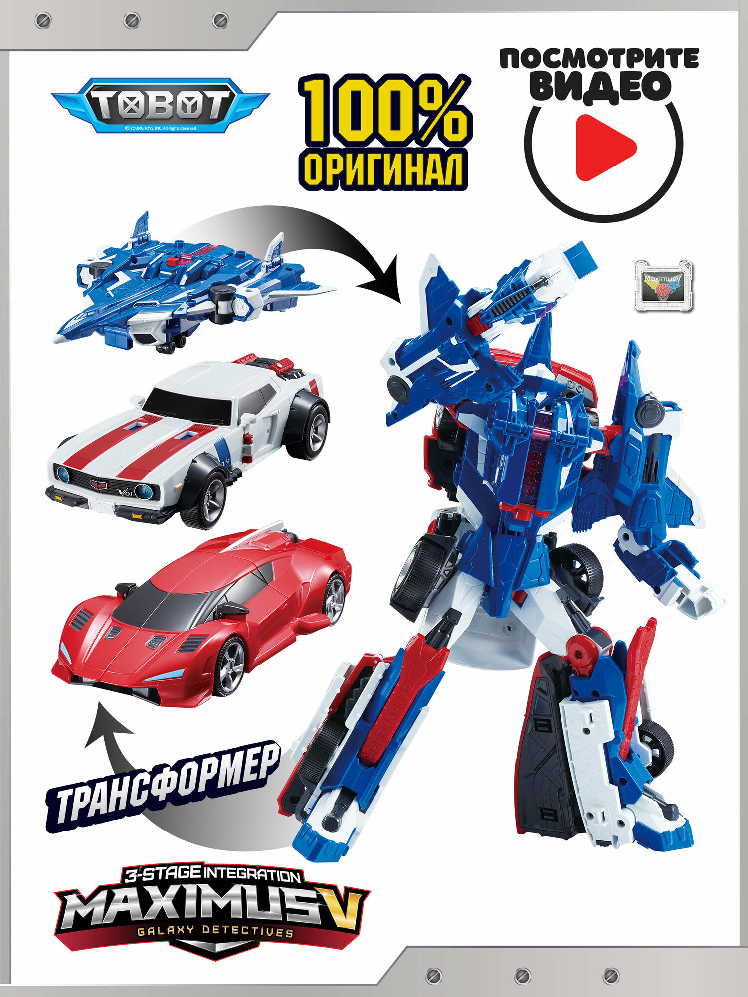 Тобот-трансформер Максимус Ви создан по мотивам нового 2-го сезона мультсериала Тоботы. Детективы Галактики премьера осенью 2021 г. на канале Карусель. Игрушка повторяет образ персонажа из мультфильма. Мощный и грозный Тобот Максимус Ви представляет собой интеграцию трех персонажей: Леон Ровер Циклон Хок, Капитан Зак.