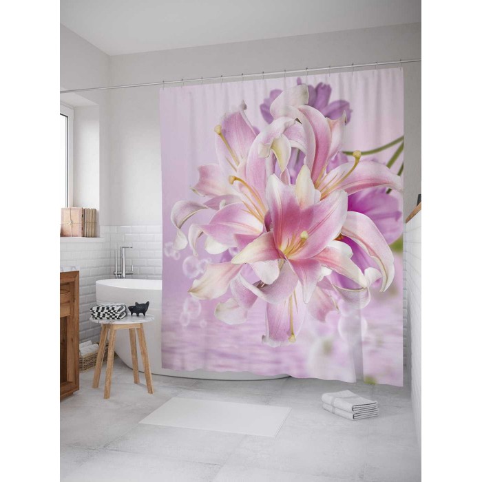 Красиво декорированная шторка, защищающая пол и оборудование ванной комнаты от брызг воды, изготовлена из полиэстера и обладает выраженными водоотталкивающими свойствами. Занавеска для ванной 180х200 комплектуется 12 прочными крючками из пластика и имеет в верхней части столько же обработанных на оверлоке отверстий. Декоративный рисунок нанесен на поверхность ткани при помощи фотопечати. Такие принты не боятся влаги и не смываются даже очень горячей водой.