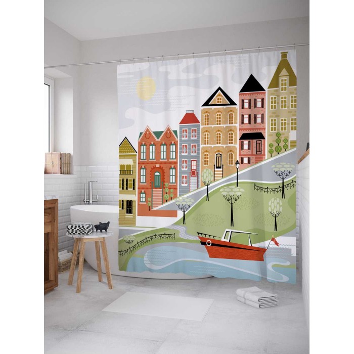 Красиво декорированная шторка, защищающая пол и оборудование ванной комнаты от брызг воды, изготовлена из полиэстера и обладает выраженными водоотталкивающими свойствами. Занавеска для ванной 180х200 комплектуется 12 прочными крючками из пластика и имеет в верхней части столько же обработанных на оверлоке отверстий. Декоративный рисунок нанесен на поверхность ткани при помощи фотопечати. Такие принты не боятся влаги и не смываются даже очень горячей водой.