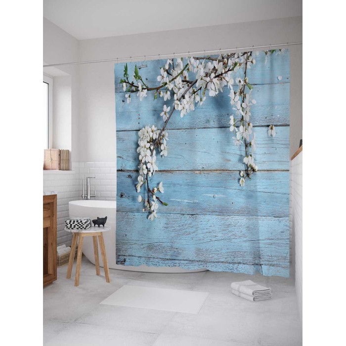 - Модель: Штора для ванной Ветка вишни на деревянных досках 180х200 см