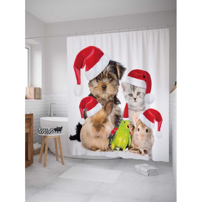 - Модель: Штора для ванной Новогодние питомцы 180х200 см