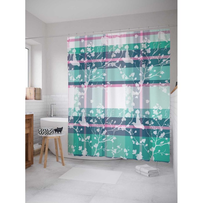 Красиво декорированная шторка, защищающая пол и оборудование ванной комнаты от брызг воды, изготовлена из полиэстера и обладает выраженными водоотталкивающими свойствами. Занавеска для ванной 180х200 комплектуется 12 прочными крючками из пластика и имеет в верхней части столько же обработанных на оверлоке отверстий. Декоративный рисунок нанесен на поверхность ткани при помощи фотопечати. Такие принты не боятся влаги и не смываются даже очень горячей водой.